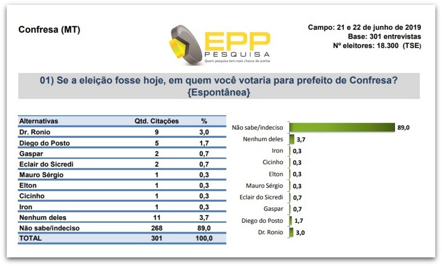 Na modalidade espontânea a pergunta era. Se a eleição fosse hoje, em quem você votaria para prefeito de Confresa? O atual prefeito Dr. Ronio Condão teve 09 intenções cerca de (3,00%) ele é seguido pelo advogado Diego do Posto com 05 intenções (1,7%), o ex-prefeito Gaspar obteve 02 intenções com (0,7%), o administrador e bancário Eclair do Sicredi empatou com o ex-prefeito e também obteve outras 02 intenções (0,7%), já os ex-prefeitos Mauro Sérgio e Iron Parreira, o vereador Elton da Saude e o suplente de vereador Cicinho do Paco Paco, obtiveram 01 intenção cada, cerca de (0,3%) para cada um deles, 11 dos entrevistados (3,7%) não votariam em ninguém, e 268 (89 %) dos entrevistados ainda não se definiram e não sabem em quem votar.