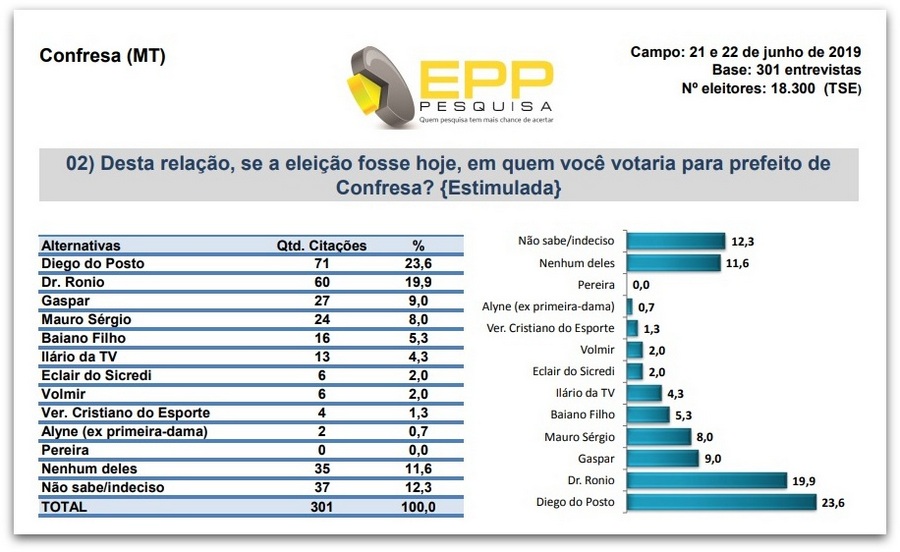 A pergunta da modalidade estimulada era a seguinte. Nesta relação de nomes se a eleição fosse hoje, em quem você votaria para prefeito de Confresa? No resultado final o advogado Diego Petersen, o Diego do Posto lidera as intenções com 23,6 % (71) ele é seguido pelo atual prefeito Dr. Ronio com 19,9% (60) e pelos ex prefeitos Gaspar com 9,0 % (27) e Mauro Sérgio com 8,0 % (24)