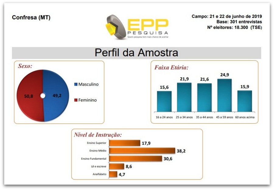 Os dados são frutos de uma pesquisa feita pela parceria do Jornal do Norte Araguaia ( www.nortearaguaia.com.br ) e o Instituto de Pesquisas EPP, durante o levantamento foram testados dois cenários, um espontâneo e outro estimulado. As amostras de campo foram feitas entre os dias 21 e 22 de junho de 2019, tendo como base 301 entrevistas de um total geral de 18.300 eleitores do município (TSE).