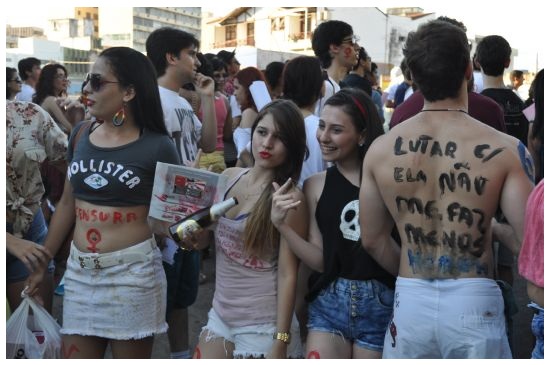 A manifestação seguiu pela Prainha, subiu a Getúlio Vargas e parou na Praça Santos Dumont. No trajeto, funks de Valesca Popozuda deram o tom, junto com o “batuque das vadias”, que seguia atrás do carro de som. Os discursos reclamavam a liberdade de escolha, o livre uso do corpo, o direto a sexualidade e fim da violência sexual.