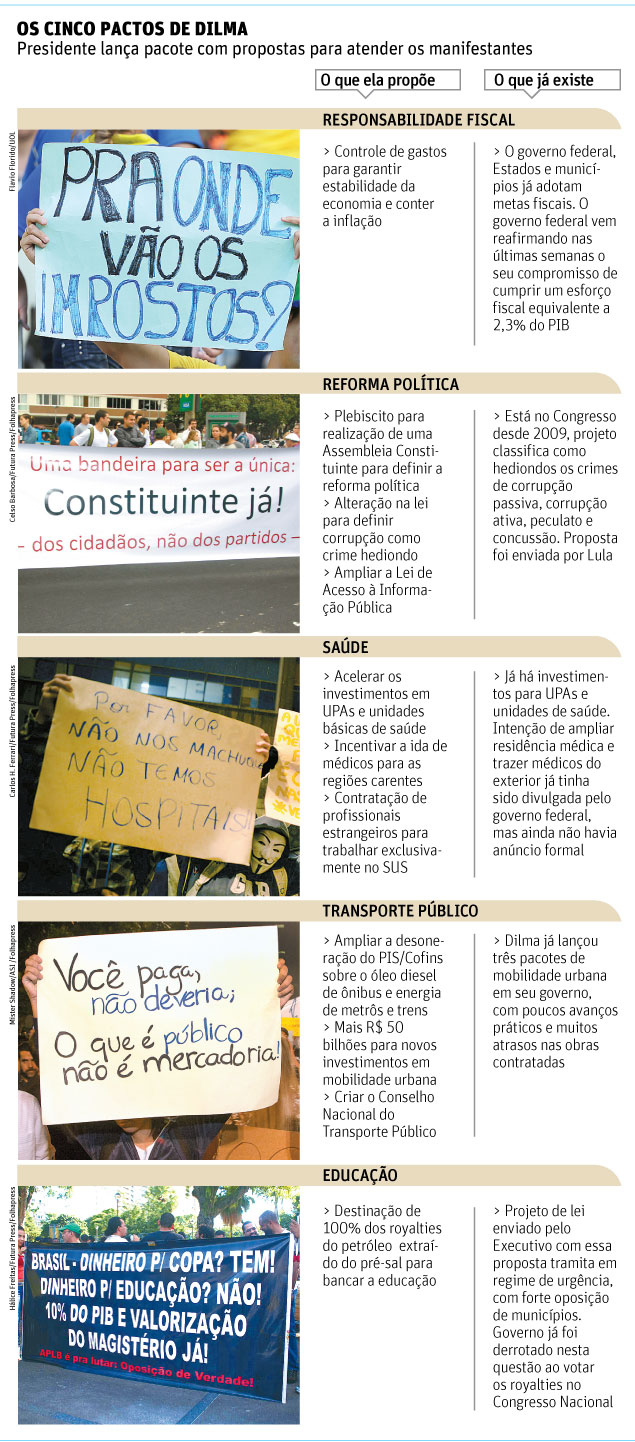 Dilma apresentou cinco "pactos em favor do Brasil", que reúnem, além da proposta do plebiscito, medidas como transformar a corrupção em crime hediondo, investir R$ 50 bilhões em mobilidade urbana e contratar médicos estrangeiros.