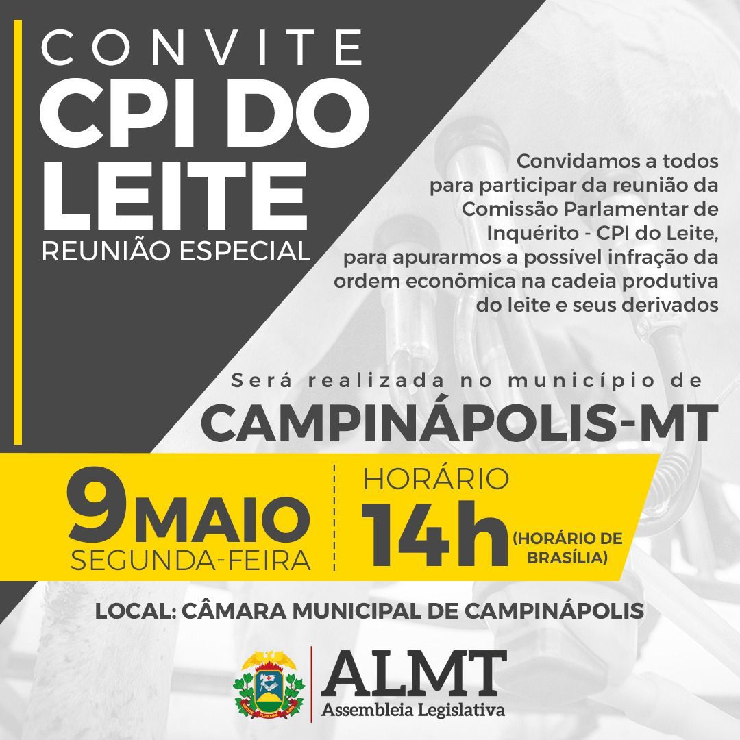 Sob a articulação do Deputado do Araguaia, Dr. Eugênio, a reunião externa a ser realizada em Campinápolis, será promovida às 14 horas, na Câmara de Vereadores. O encontro aberto para toda a sociedade contará com a participação dos demais membros da CPI, além de representantes da bacia leiteira.