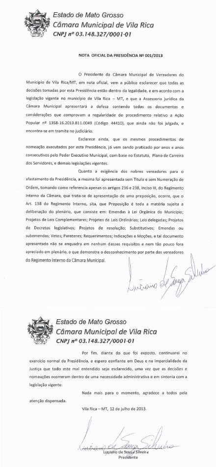 O Vereador e Presidente da Câmara Municipal de Vila Rica, na região do Norte Araguaia, Luciano de Souza Silveira (PTB), emitiu na noite do domingo, dia 14/07, nota oficial sobre o pedido de afastamento do cargo da Presidência da Câmara Municipal, que foi protocolado na sexta feira, dia 12/07, pelos demais vereadores de Vila Rica.