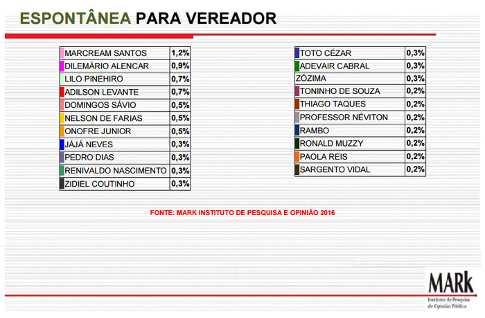 Na oitava posição, aparecem sete nomes com 0,3%. São o suplente de deputado estadual Jajah Neves (PDT), que tem base em Várzea Grande; vereadores Renivaldo Nascimento (PDT) e Adevair Cabral (PDT); Pedro Dias, Zidiel Coutinho (PSB), Totó Cézar e Zózima.