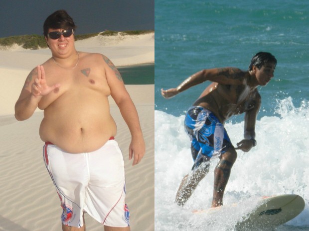 O cearense Ricardo Fontenelle, de 30 anos, conseguiu perder 60 quilos com alimentação saudável e muito exercício. Durante o emagrecimento, ele descobriu a paixão pelo surfe e, com a prática do esporte, eliminou 40 quilos do total perdido.