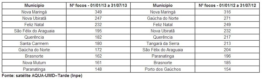 Neste cenário, cinco municípios mato-grossenses contabilizaram mais de mil focos entre janeiro e julho deste ano, sendo os principais: Nova Maringá (349), Nova Ubiratã (247) e Feliz Natal (232).