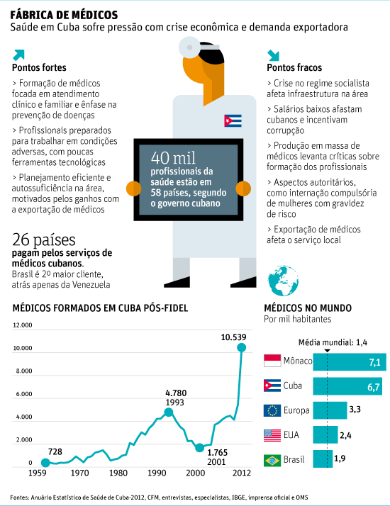 "É verdade que os médicos cubanos vão receber no Brasil bem mais do que recebem em Cuba. Mas também é verdade que o Estado também vai receber bem mais alto rendimento. A empresa estatal tem um modelo de rentabilidade de negócio baseado em baixíssimos salários. O que está ocorrendo é uma extensão desse modelo, levado à Venezuela, ao Brasil."